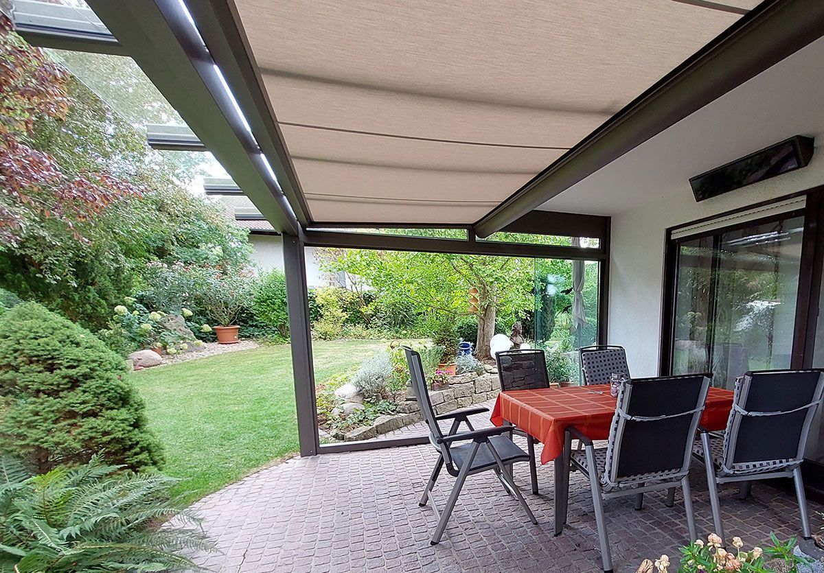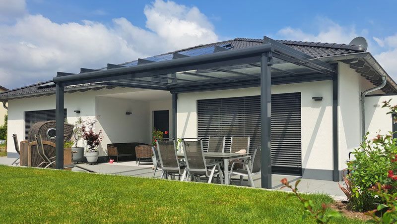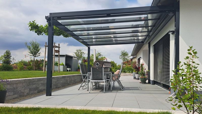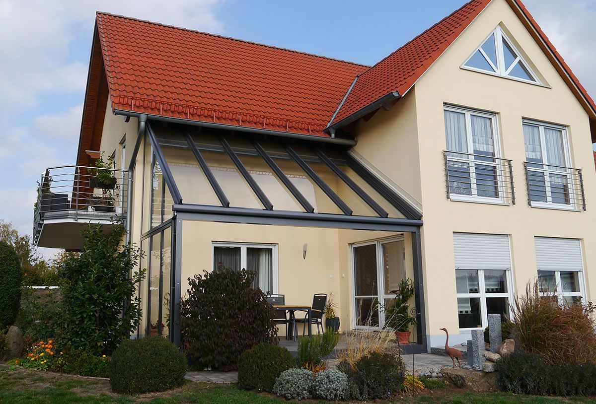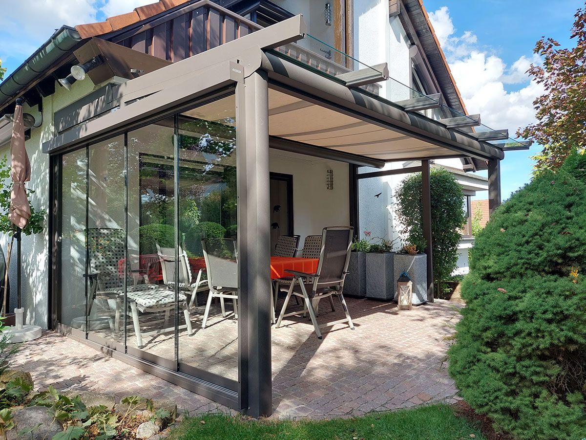 Terrassendächer, Beschattungen und Glaselemente stammen aus einer Hand – für eine unkomplizierte Installation und einfache Erweiterung.